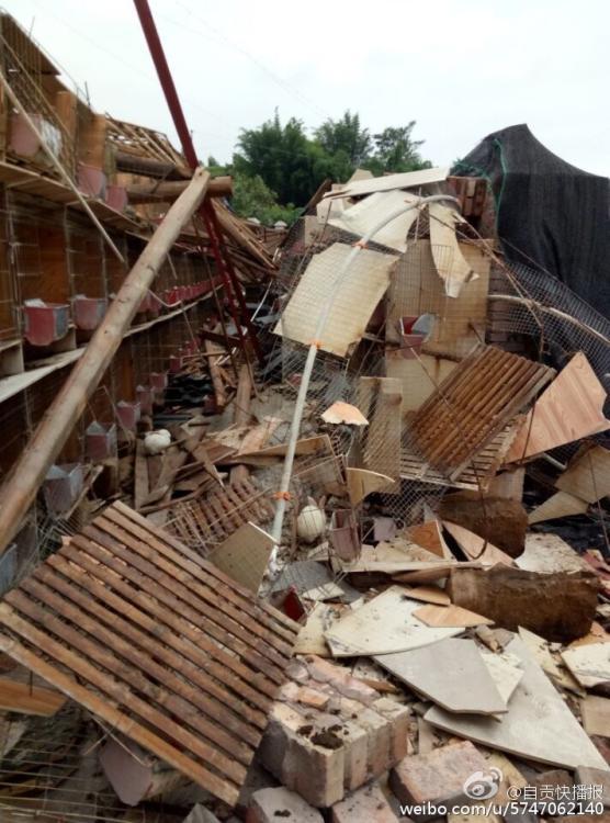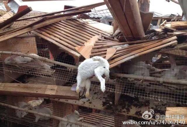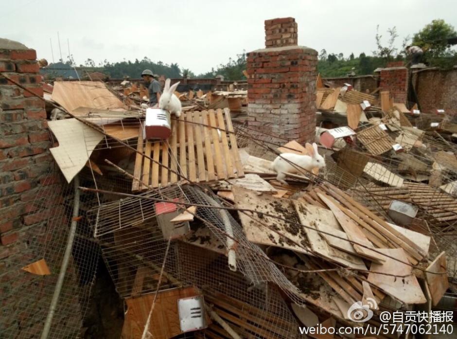 7月12日凌晨5時(shí)許,陣性大風(fēng)突襲四川自貢榮縣古文鎮(zhèn),風(fēng)災(zāi)使古文鎮(zhèn)山邊村鄉(xiāng)巴佬養(yǎng)殖基地6000平米兔舍垮塌,事發(fā)時(shí),該兔舍共有26000只兔子。記者在現(xiàn)場(chǎng)看到,兔舍頂棚已經(jīng)被完全吹跨,木制橫梁和隔板隨處散落,部分兔舍仍有大量兔子被埋,10余名工人正在清理現(xiàn)場(chǎng)和搶救活兔。據(jù)兔舍負(fù)責(zé)人介紹,經(jīng)過近30多小時(shí)生產(chǎn)自救已搶救出5000余只活兔,初步估計(jì)有10000余只兔子死亡,直接損失超過300萬元。(記者 曹實(shí)秋)圖片來源:華西都市報(bào)自貢城市頻道官方微博