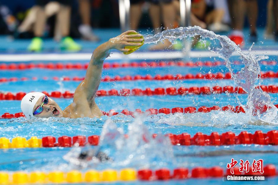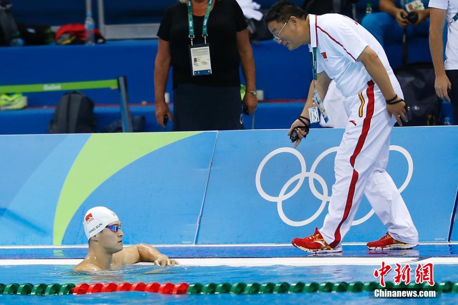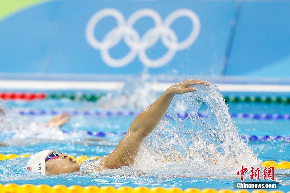 當(dāng)?shù)貢r間8月4日,里約奧林匹克水上項目體育館,中國游泳選手孫楊在泳池內(nèi)進(jìn)行賽前訓(xùn)練。中新網(wǎng)記者 盛佳鵬 攝