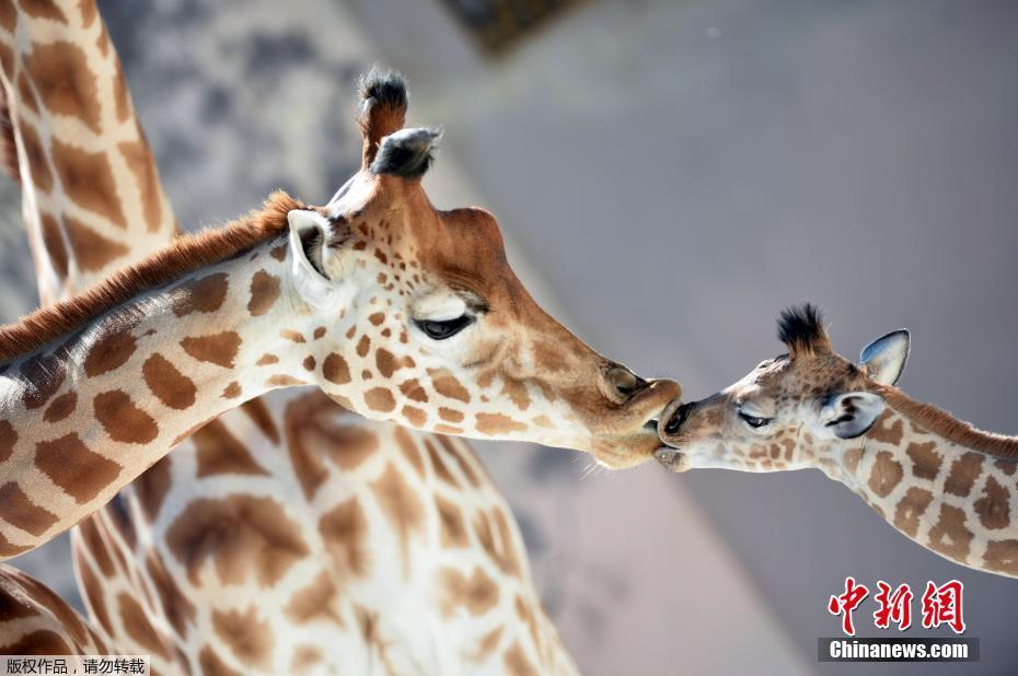 近日,法國(guó) La Fleche,12歲的南非長(zhǎng)頸鹿Dioni誕下可愛(ài)寶寶Kenai。攝影師記錄了出生才幾天的小長(zhǎng)頸鹿和媽媽的親昵瞬間。圖為Kenai正在親吻母親。