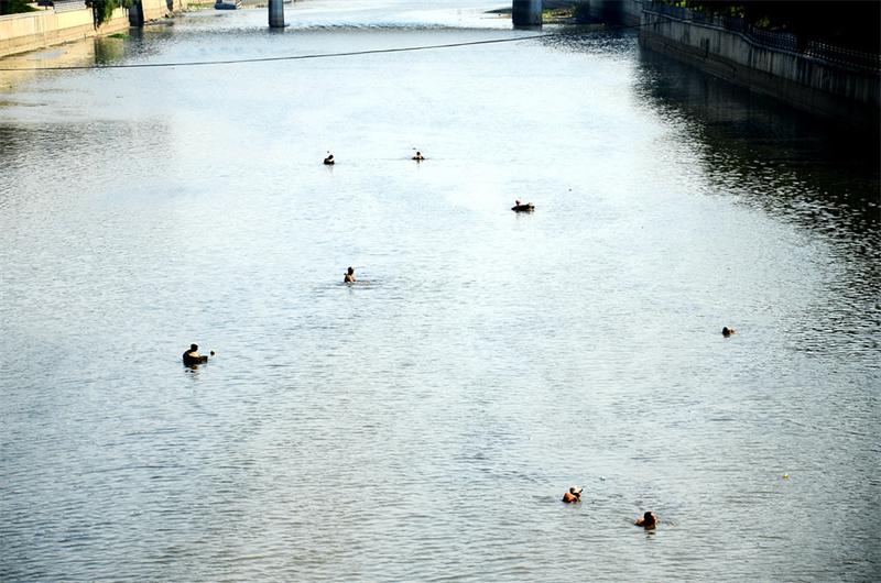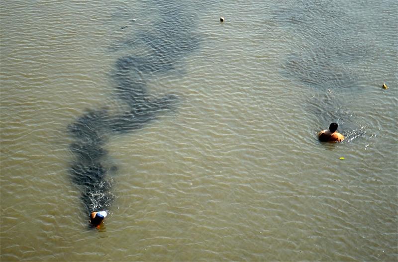 22日,在濟(jì)濼橋下的小清河,10多名男子整個(gè)身體浸泡在水中,只有頭部露出水面。
