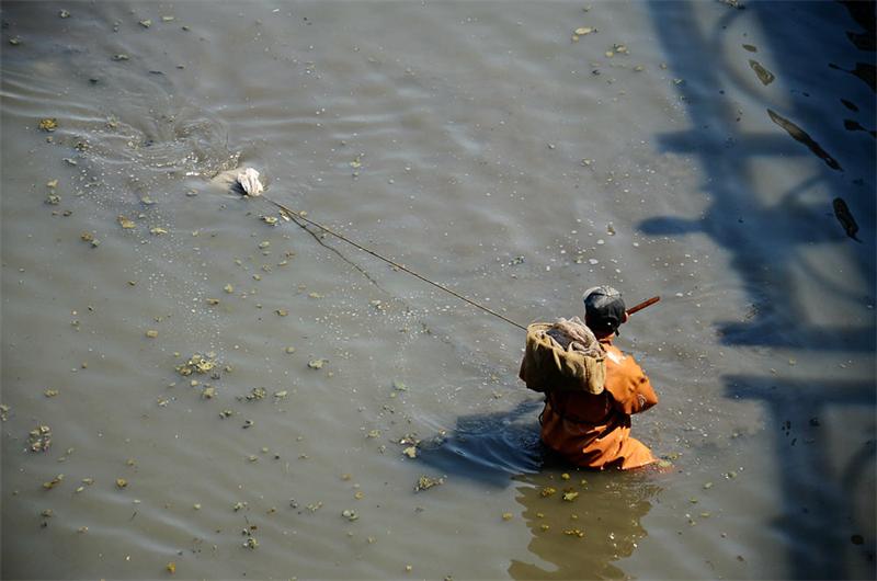 仔細(xì)觀察才發(fā)現(xiàn)男子們都身穿連體防水衣,在蹲在發(fā)臭的河水中,將網(wǎng)撒到河底后左右攪拌,河底的淤泥被攪了上來,河水立刻變得非常渾濁,搖晃漁網(wǎng)篩去淤泥后,把剩下的紅線蟲倒入塑料袋中。
