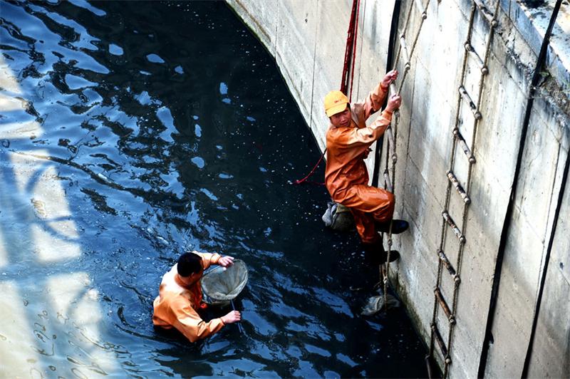據(jù)了解,近期小清河開閘防水,河道水深不足1米,這幾名男子從河岸上放下軟梯,進(jìn)入河中捕撈紅線蟲。