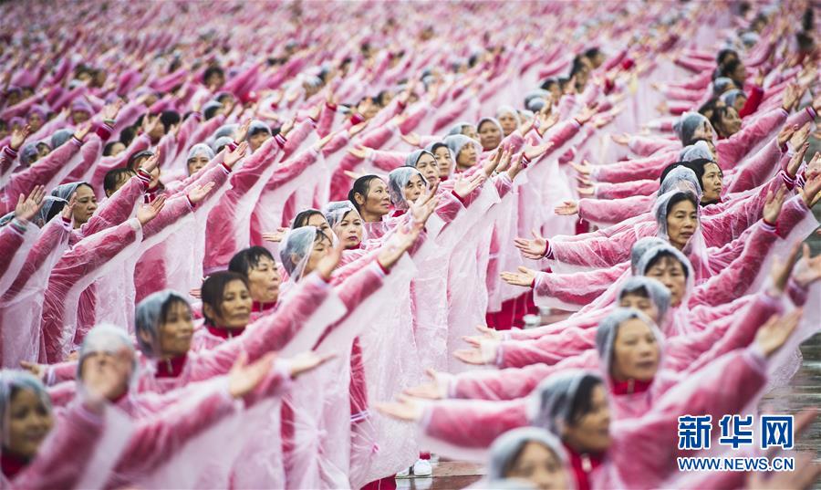 11月7日,在武漢黃陂云霧山,廣場舞愛好者一同起舞。當日上午,在天津、北京、上海、武漢、濟南等14個城市的不同場地上,50085人共同起舞,創(chuàng)下新的最大規(guī)模排舞(多場地)吉尼斯世界紀錄。新華社記者肖藝九攝