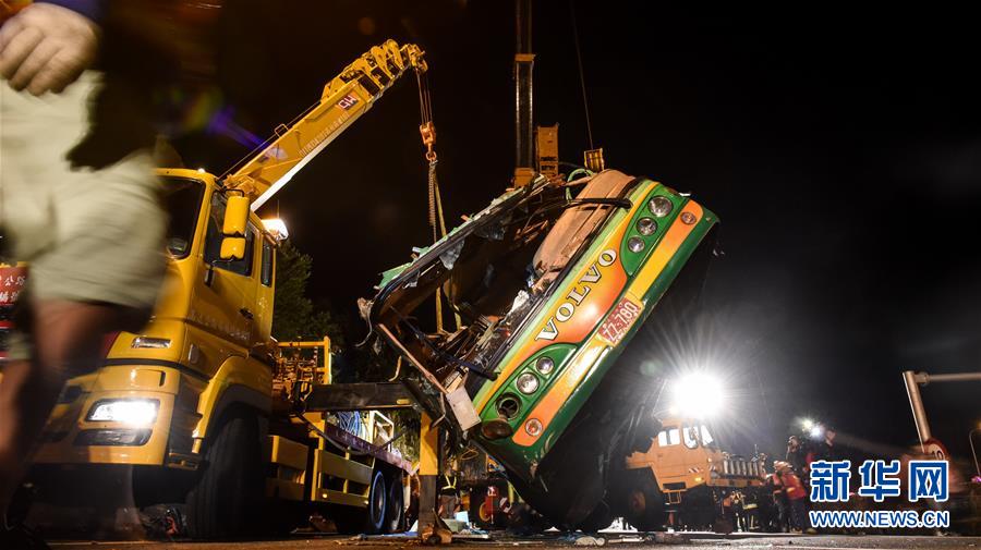2月14日,事故車(chē)輛被吊車(chē)吊起。據(jù)臺(tái)灣消防部門(mén)2月14日零時(shí)許發(fā)布的消息,13日晚發(fā)生的翻車(chē)事故已造成32人死亡,受傷的12人已全數(shù)送醫(yī)。新華社記者從臺(tái)灣公路警察部門(mén)獲悉,游覽車(chē)上沒(méi)有大陸游客。臺(tái)北市消防局通報(bào),13日21時(shí)6分許,在臺(tái)灣公路主干道5號(hào)南港系統(tǒng)交流道接3號(hào)南下路段,臺(tái)北市蝶戀花公司一輛游覽車(chē)翻覆于引道邊坡,車(chē)內(nèi)共44人(游客42人,導(dǎo)游、司機(jī)各1人),其中死亡32人(30人未送醫(yī),2人送醫(yī)后不治),12人送醫(yī)持續(xù)治療中。新華社記者 歐東衢 攝
