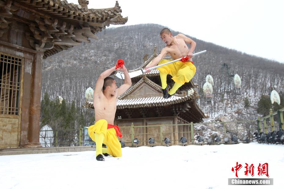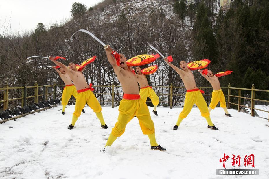 2月22日,河南出現(xiàn)暴雪天氣,氣溫驟降,少林寺所在地登封嵩山白雪茫茫,銀裝素裹,武僧們赤膊上身在冰天雪地里苦練少林功夫。盡管寒風(fēng)刺骨,少林武僧們依舊照常練功,只見(jiàn)他們赤膊上陣,不懼寒冷,在雪窩里扎馬步、練少林棍、刀槍對(duì)戰(zhàn)。他們中間最小的只有6歲。 中新社記者 王中舉 攝