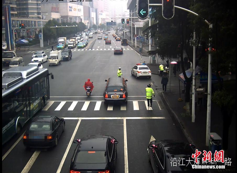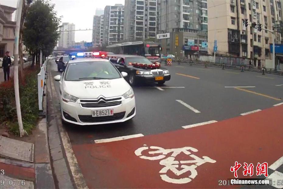 2月22日,湖北宜昌一位新郎在迎親時(shí),迎親車隊(duì)的頭車因涉嫌套牌被交警查獲。在新郎家屬和交警溝通后,當(dāng)?shù)亟痪诵曰瘓?zhí)法,先“開道護(hù)送”,迎親結(jié)束后才扣下套牌車。圖為警車“護(hù)送”新人完成儀式。石寧 攝