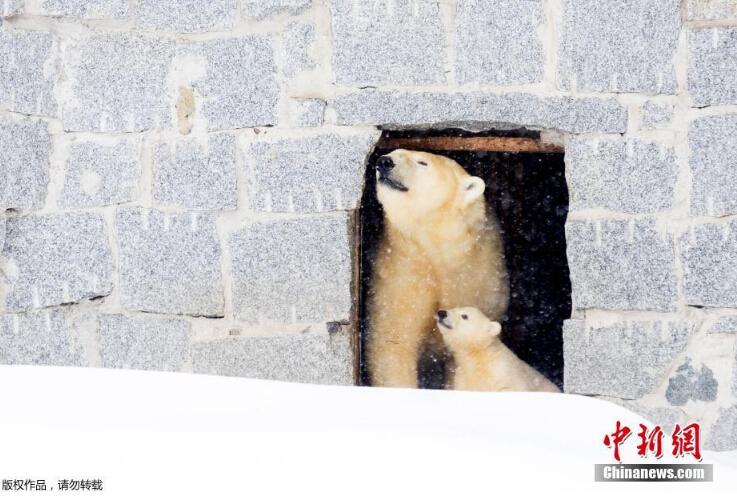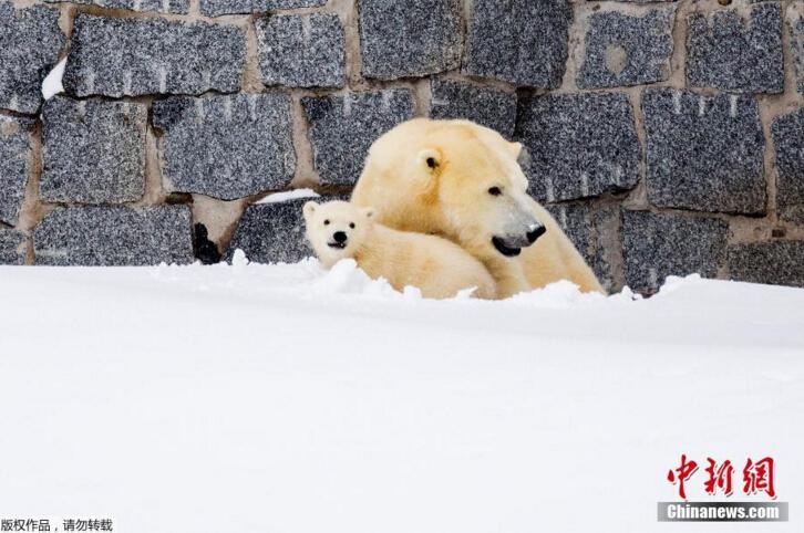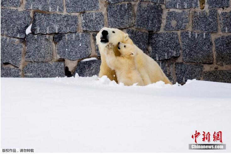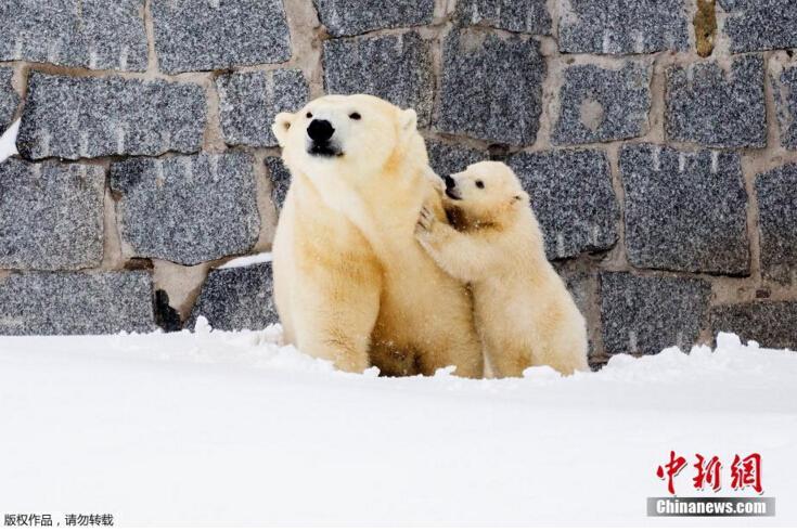 當(dāng)?shù)貢r間3月15日,芬蘭一野生動物園內(nèi),北極熊母親帶著她的幼崽第一次在戶外亮相。小北極熊第一次在雪中玩耍,跟母親“求抱抱”。