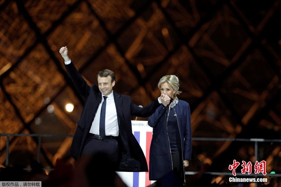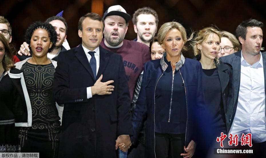 巴黎時間5月7日晚,法國總統(tǒng)選舉第二輪投票初步計票結(jié)果顯示,中間派獨立候選人、“前進”運動領(lǐng)導人埃馬紐埃爾·馬克龍以大幅優(yōu)勢擊敗極右翼政黨“國民陣線”候選人馬麗娜·勒龐。年僅39歲的馬克龍由此成為法國史上最年輕的總統(tǒng),也成為世界上最年輕的大國領(lǐng)導人。圖為馬克龍(左二)和妻子布麗吉特(右二)在慶祝勝選的集會上向支持者致意。中新社記者 龍劍武 攝