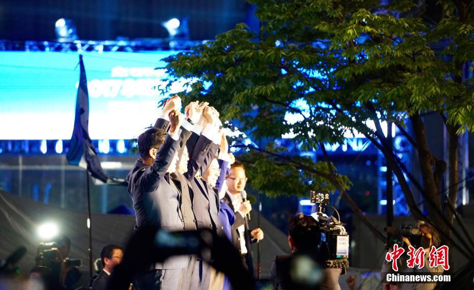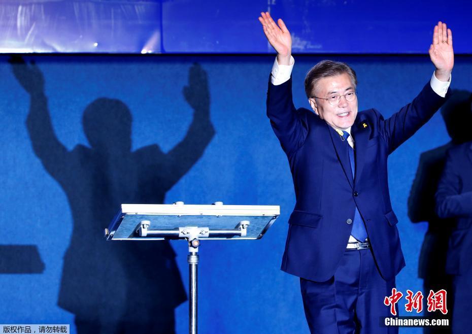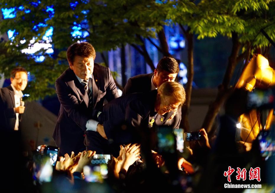 當?shù)貢r間5月9日深夜,韓國第19屆總統(tǒng)選舉共同民主黨候選人文在寅及其競選團隊現(xiàn)身首爾光化門廣場,發(fā)表“勝選演說”,與支持民眾握手慶祝。據(jù)出口民調(diào)顯示,文在寅在當日進行的大選投票中以41.4%的支持率絕對優(yōu)勢勝選。在選舉管理委員會公布的大部分開票結果中,文在寅得票率也遙遙領先,提前鎖定勝局。 中新社記者 吳旭 攝