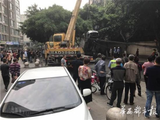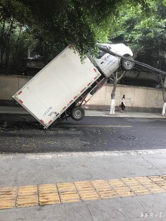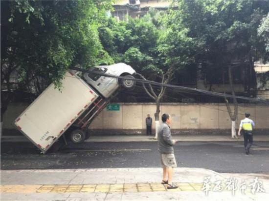5月10日早上,成都高升橋北街,一輛貨車玩起“特技”,車頭掛在線纜上,四輪騰空,造成道路擁堵,索性無人員傷亡。隨后,記者從成都交警一分局獲悉,該事故的罪魁禍?zhǔn)?,是掉落的通訊線纜。來源:華西都市報