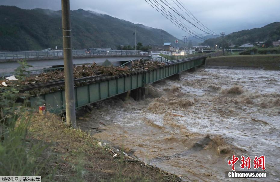 九州島福岡縣,洪水帶來的雜物堆滿鐵道,橋下洪流滾滾。
