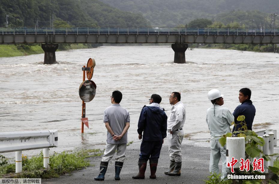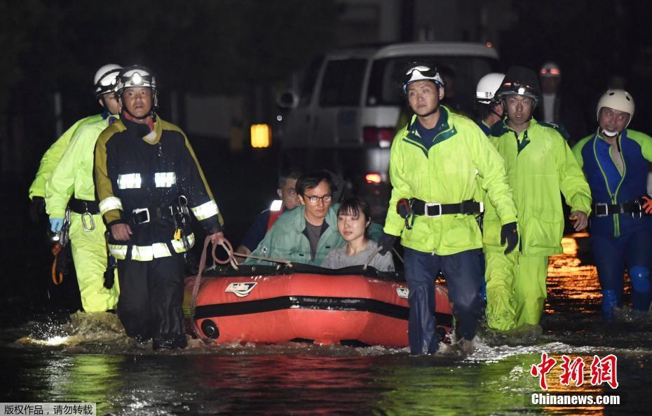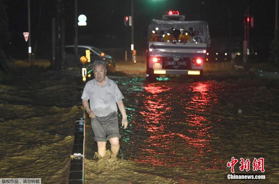 臺風(fēng)導(dǎo)致日本最少47班國內(nèi)線航班取消,3000名旅客受影響,3人因風(fēng)暴引起的事故受傷。圖為福岡縣朝倉地區(qū)的居民在洪水中跋涉。