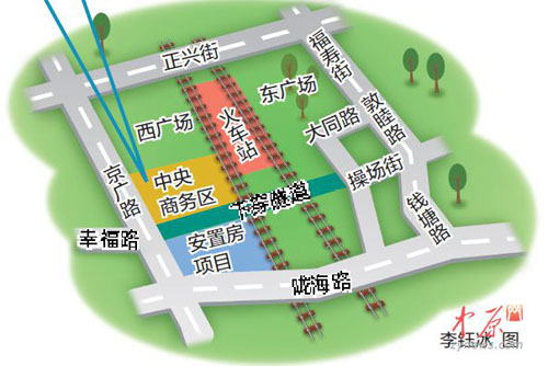 讓人欣喜的是,西廣場(chǎng)南側(cè)的幸福路將連接火車(chē)站東西兩個(gè)廣場(chǎng),打通下穿隧道。幸福路南起京廣路,北到操場(chǎng)街,不但可行駛機(jī)動(dòng)車(chē),還可供非機(jī)動(dòng)車(chē)、行人通行。從規(guī)劃圖上可看出,規(guī)劃中的幸福路,和現(xiàn)狀幸福路,不在一條直線上,它們?cè)诰V路上有拐角。