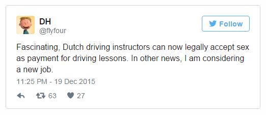 據(jù)荷蘭新聞(Dutchnews)網(wǎng)站12月14日報道了該國議會一件令人震驚的決議——駕校教練可以用性回報代替現(xiàn)金來收費。這一消息引起媒體大嘩,大約一周后(21日),各國媒體議論紛紛。赫芬頓郵報的副標(biāo)題就是“Ride for a ride”意為可以用性來換一段路程,CNN報道稱:“Go Dutch”現(xiàn)在有了新的意味,因為歐洲男性開始涌向荷蘭,遞交擔(dān)任駕校教練申請。根據(jù)荷蘭政府方面的消息,申請量比之前增加了5倍。