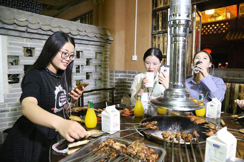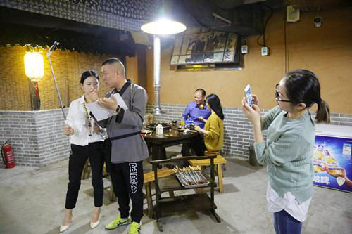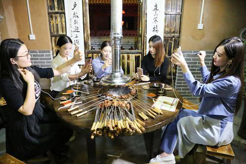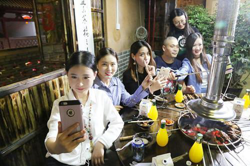 在岳家水滸烤肉店里,主播們剛剛坐下直播,就吸引來了在店里消費的其他顧客,肉都顧不上吃了,求合影,求關(guān)注……