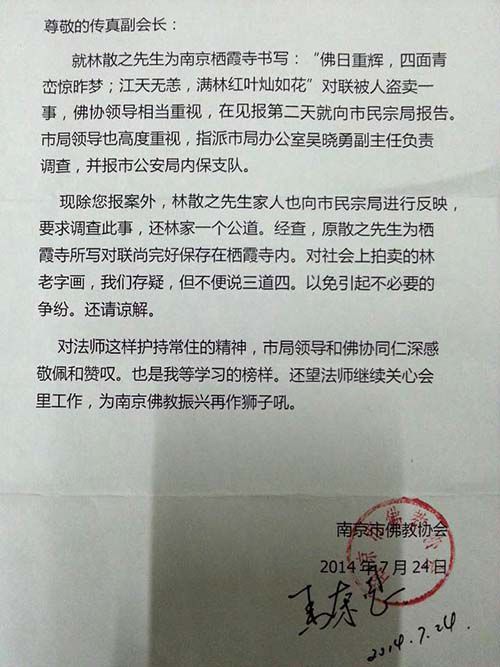 7月24日,傳真法師收到一封南京市佛教協(xié)會(huì)的回函?;睾Q(chēng),除了傳真法師報(bào)案外,林散之家人也向市民宗局反映,要求調(diào)查此事,還林家一個(gè)公道。
