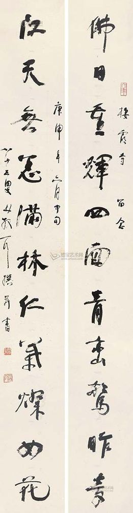 北京匡時(shí)國(guó)際拍賣(mài)有限公司描述稱(chēng),林散之先生的這副作品作于1980年,為棲霞寺所書(shū),林氏時(shí)年83歲,已是人書(shū)俱老的時(shí)期……林散之筆下的線(xiàn)條曲中有直,直中寓曲,剛中有柔,柔中寓剛,從而達(dá)到一種清逸虛妙之境。林散之的草書(shū)風(fēng)格雖然欹正相生,但往往會(huì)把其中的變化復(fù)歸平正,偏能得中,奇而能穩(wěn),故顯得格外的老成與持重。由于林散之的藝術(shù)思想受佛家影響較深,而此為“三論宗”的發(fā)源地棲霞寺所書(shū),更能見(jiàn)其書(shū)寫(xiě)之虔誠(chéng)。