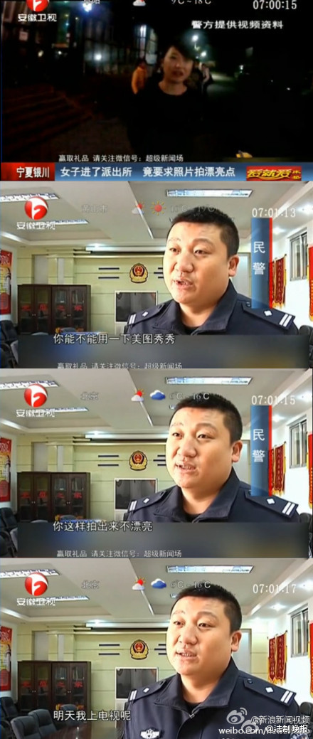 人民網(wǎng)北京11月4日電 據(jù)寧夏回族自治區(qū)公安廳官方微博消息,日前,寧夏銀川,一名女子因搶奪執(zhí)法記錄儀,阻撓執(zhí)法被警察帶走。民警在審訊室準備對其拍照時,女子竟然要求民警用美圖軟件,聲稱:“你這樣拍出來不漂亮,明天我上電視吶?!?/p>
