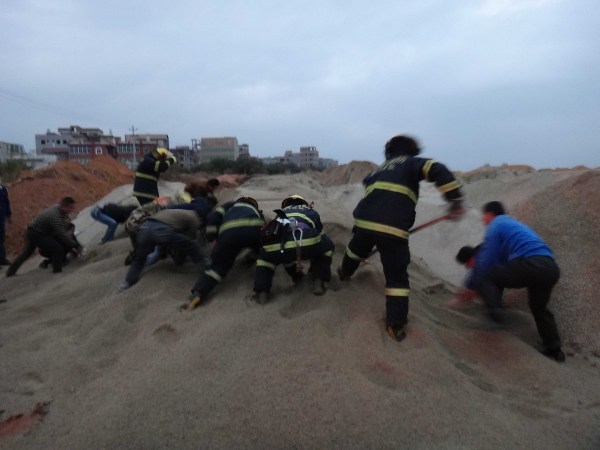 事發(fā)時,一部運沙車卸沙,結(jié)果男孩不幸被沙子填埋。馬巷消防中隊接到報警后,立即出動2部車、14名消防官兵前往現(xiàn)場營救。民警也很快到場,現(xiàn)場一名小孩說男孩被壓埋在前面的沙子堆里。消防官兵迅速拿出鐵鍬挖沙子,與先后調(diào)來的挖掘機和推土機一起工作,附近熱心群眾拿來鐵鏟加入到救援隊伍當(dāng)中。