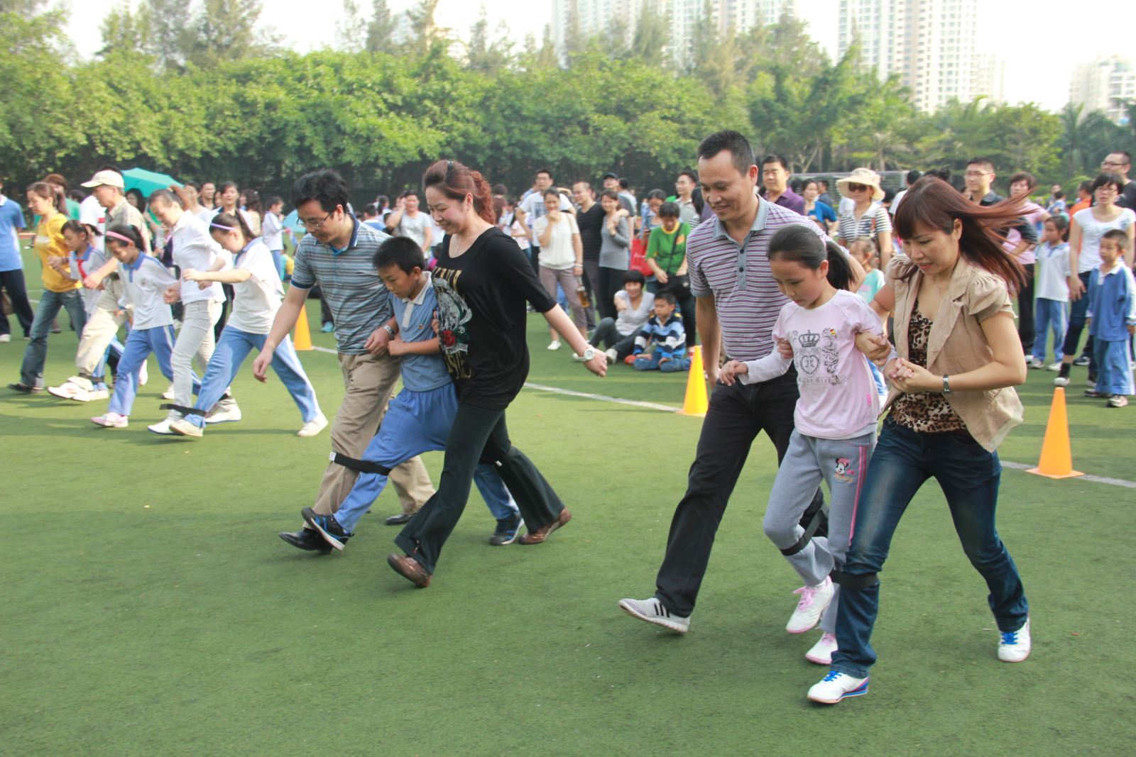 游戲規(guī)則:活動分組進(jìn)行,每個家庭(兩大一小)為一組,家長在兩邊,孩子在中間,家長和孩子相鄰的兩條腿用10cm寬,60cm長的紅色布條綁住,聽到口令后,三人一齊向前跑,看誰先跑到終點為勝。(每組最多為5個家庭參與,活動分三組進(jìn)行)