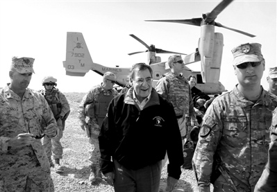 14日,正在阿富汗訪問(wèn)的美國(guó)國(guó)防部長(zhǎng)帕內(nèi)塔乘軍機(jī)抵達(dá)一處軍事基地
