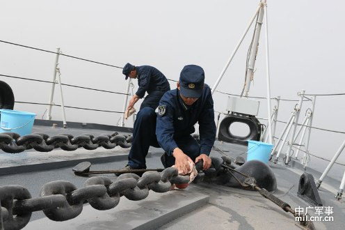 3月21日,海軍第十一護(hù)航編隊(duì)首次獨(dú)立執(zhí)行護(hù)航任務(wù)。受沙塵暴影響,能見度降低。圖為“青島”艦官兵在清潔掃除。米晉國攝影