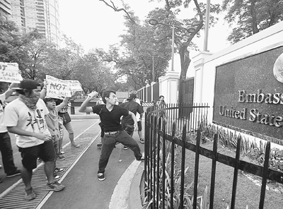 4月16日,在菲律賓首都馬尼拉,抗議菲美聯(lián)合軍演的示威者向美國駐菲大使館外墻投擲顏料。新華社發(fā)