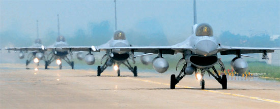 圖為韓國(guó)空軍KF-16戰(zhàn)斗機(jī)降落在第一戰(zhàn)斗飛行團(tuán)跑道上,正前往停機(jī)場(chǎng)。