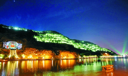 夜色下的龍門在各色燈光的映照下美輪美奐,萬千佛陀現(xiàn)金身。記者 陳曉東 攝 啟天 制圖