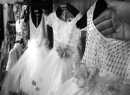 “這個(gè)送珍珠腰帶,走(賣(mài))得可好,帶一件吧!”昨天下午2點(diǎn),鄭州市豐產(chǎn)路某店鋪內(nèi),女老板正在向一位女士推銷(xiāo)熱賣(mài)的“公主裙”。仔細(xì)看,這條粉紅色的裙子,腰間綴著由花生米大小的“珍珠”做的腰帶,袖口邊緣處還貼著亮閃閃的貼片,看著確實(shí)華麗。經(jīng)過(guò)一番討價(jià)還價(jià),該女士花100元為上幼兒園的女兒買(mǎi)了條裙子。令她不滿意的地方,就是似乎珍珠腰帶縫得并不緊,“珍珠是一根單線穿下來(lái)的,穿不了幾次,就該斷了”。