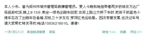 前天23時25分,一位微博名叫“勤行者有志”的網(wǎng)友發(fā)布了一條微博,稱自己是“小朱”,曾為鄭州市城市管理局微博管理員,妻姐把一輛藍色的嬰兒推車落在了出租車后備廂,希望大家?guī)兔ふ摇?/p>