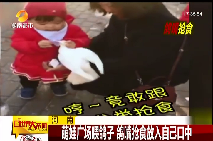 萌娃鴿嘴搶食放入自己口中
