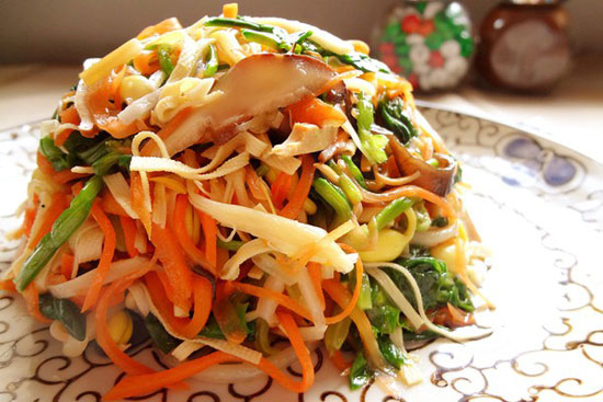 《金陵歲時記》記載了南京人除夕的“十景菜”(也叫什錦菜),人們以醬姜、黃瓜、胡蘿卜、金針菇、木耳、冬筍、白芹、醬油干、百葉、面筋十種,細切成絲,以油炒之,這就是所謂的“十景”。這些菜都有著美好的寓意:黃瓜,象征瓜瓜連連、子孫蔓延;冬筍,象征雨后春筍節(jié)節(jié)高;百葉,象征百依百順樣樣順,都是要討個吉利的口彩。現(xiàn)在的什錦菜已經(jīng)不止10種了,甚至多達16-18種,增加了藕,象征路路通;黃豆芽,象征如意;薺菜,象征聚財;馬齒莧,南京又稱安樂菜,象征平安喜樂。