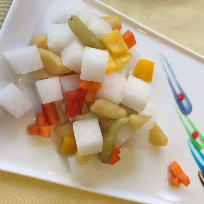 做法:象牙白蘿卜去皮切丁,仔姜和彩椒分別切丁,用白糖,白醋,玫瑰露酒調(diào)成汁,把所有原料泡進(jìn)去,放冰箱腌2小時即可食用。