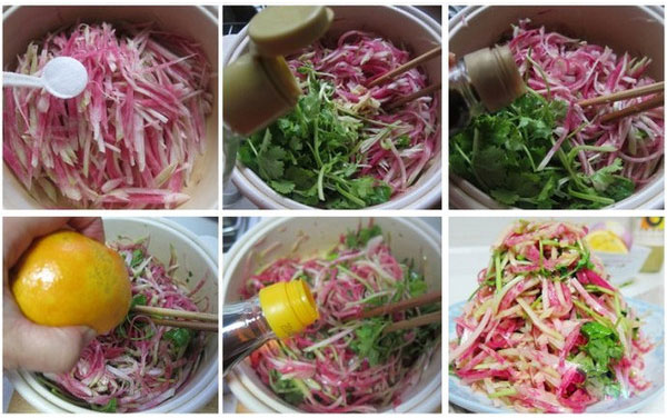 食材:水果蘿卜一個(gè),香菜幾棵,橙子半個(gè)(取汁),白醋、調(diào)汁魚(yú)露、麻油、鹽等少許。