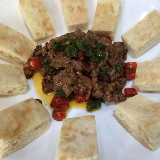 4、鍋中留少許油,將蔥花,蒜蓉炒香,然后倒入滑過(guò)油的牛肉,加入鹽,味精,雞粉,蠔油,黑胡椒,最后加入適量辣椒油翻炒均勻就可以出鍋了,再搭配上松軟可口的發(fā)面餅。