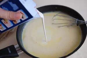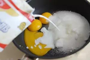 1、蛋黃、細(xì)砂糖、牛奶全部倒入小鍋中,并攪拌均勻。