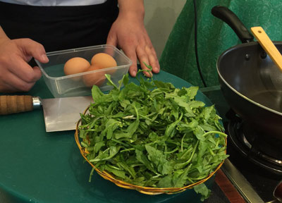一、雞蛋打散,放入可加熱容器中。薺菜切成小末。