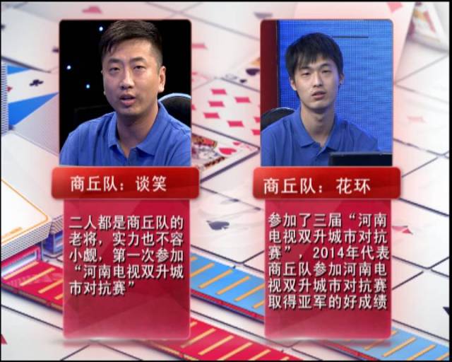 商丘隊(duì)派出了“花環(huán)”和“談笑”。兩人都是商丘隊(duì)的老將,實(shí)力不容小覷。“花環(huán)”曾參加三屆“河南電視雙升城市對(duì)抗賽”;2014年代表商丘隊(duì)參加“河南電視雙升城市對(duì)抗賽”,并取得亞軍的好成績(jī)。“談笑”第一次參加“河南電視雙升城市對(duì)抗賽”。