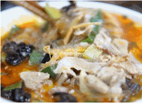 將羊肉和羊骨放入鍋中一起熬制成鮮香的羊湯,將大鍋里熬好的羊湯放入小鍋中,加入木耳粉絲黃花菜蔥花,煮的軟爛的羊肉切成片狀,放入鍋中一起熬制,再放一點(diǎn)羊油辣椒用筷子輕輕一攪,羊湯的香味混著辣椒的焦香,這香味讓人無法拒絕,相信這地道的登封燴羊肉一定能俘獲韓寒的胃。