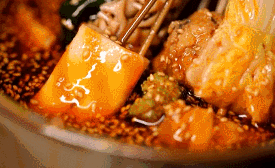 精心熬制四個(gè)小時(shí)的紅油,加了各種香料的冰鎮(zhèn)底湯,撒上用油炒的噴香的芝麻,合而為一才是冷鍋串的精髓,串串全部放入大缽缽中,再澆上香氣濃郁的料湯,食材吸收料湯后開(kāi)始入味,浸泡的時(shí)間越久就越好吃,而最正宗的吃法還要加冰,想想這冰爽。