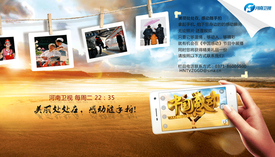 生活中某些情景在瞬間即能帶來感動(dòng),它適于簡(jiǎn)潔有力地表現(xiàn)。感動(dòng)隨手拍邀請(qǐng)您遇到生活的感動(dòng)瞬間,或樂于助人,或見義勇為,或甘于奉獻(xiàn),甚至只是讓你有所觸動(dòng)的溫情瞬間,請(qǐng)隨手拍下照片或者視頻。河南衛(wèi)視《中國感動(dòng)》欄目將在結(jié)尾以集錦的形式播出。一旦被節(jié)目選上 登上節(jié)目播出就會(huì)有獲獎(jiǎng)資格。