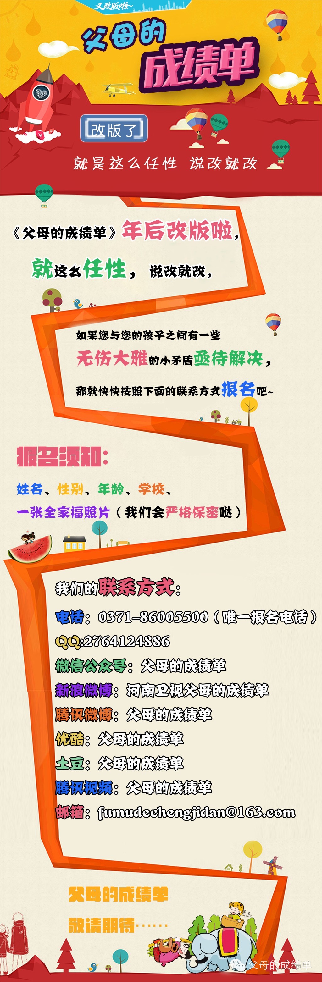 年后,經(jīng)過(guò)導(dǎo)演大大和眾小編們的熱切商討,《父母的成績(jī)單》又改版啦。我們就是這樣任性,說(shuō)改就改,為了什么?為了讓可敬可愛(ài)的觀(guān)眾朋友們看到更優(yōu)質(zhì)更具有內(nèi)涵的節(jié)目,希望你們能喜歡我們的節(jié)目,能感受到我們每一位幕后工作者的用心付出。我們真誠(chéng)的期望每一位家長(zhǎng)都能耐心的用更好的方式來(lái)與您的孩子溝通相處,更期望每一位孩子都能健康快樂(lè)的成長(zhǎng)。