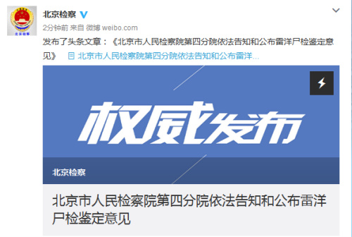 中新網(wǎng)6月30日電 北京市人民檢察院官方微博今日通報(bào),稱確定死者雷洋符合胃內(nèi)容物吸入呼吸道致窒息死亡。